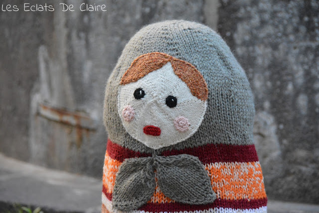 Parmi ces huit matriochkas, se glisse discrètement une Ukrainienne. J'étais un peu ennuyée de mettre en avant un emblème de la Russie sans d'une manière ou d'une autre pointer leur dirigeant actuel qui me fait des frissons dans le dos. J'étais aussi fortement enquiquinée par les valeurs traditionnelles que peuvent véhiculer les poupées russes. Elles symbolisent la maternité mais d'une certaine manière cloisonnent aussi les femmes à cette image-là. Tricoter des poupées russes avec de jolis motifs fleuris, ok, mais il ne fallait pas que ça vienne piétiner mes convictions.